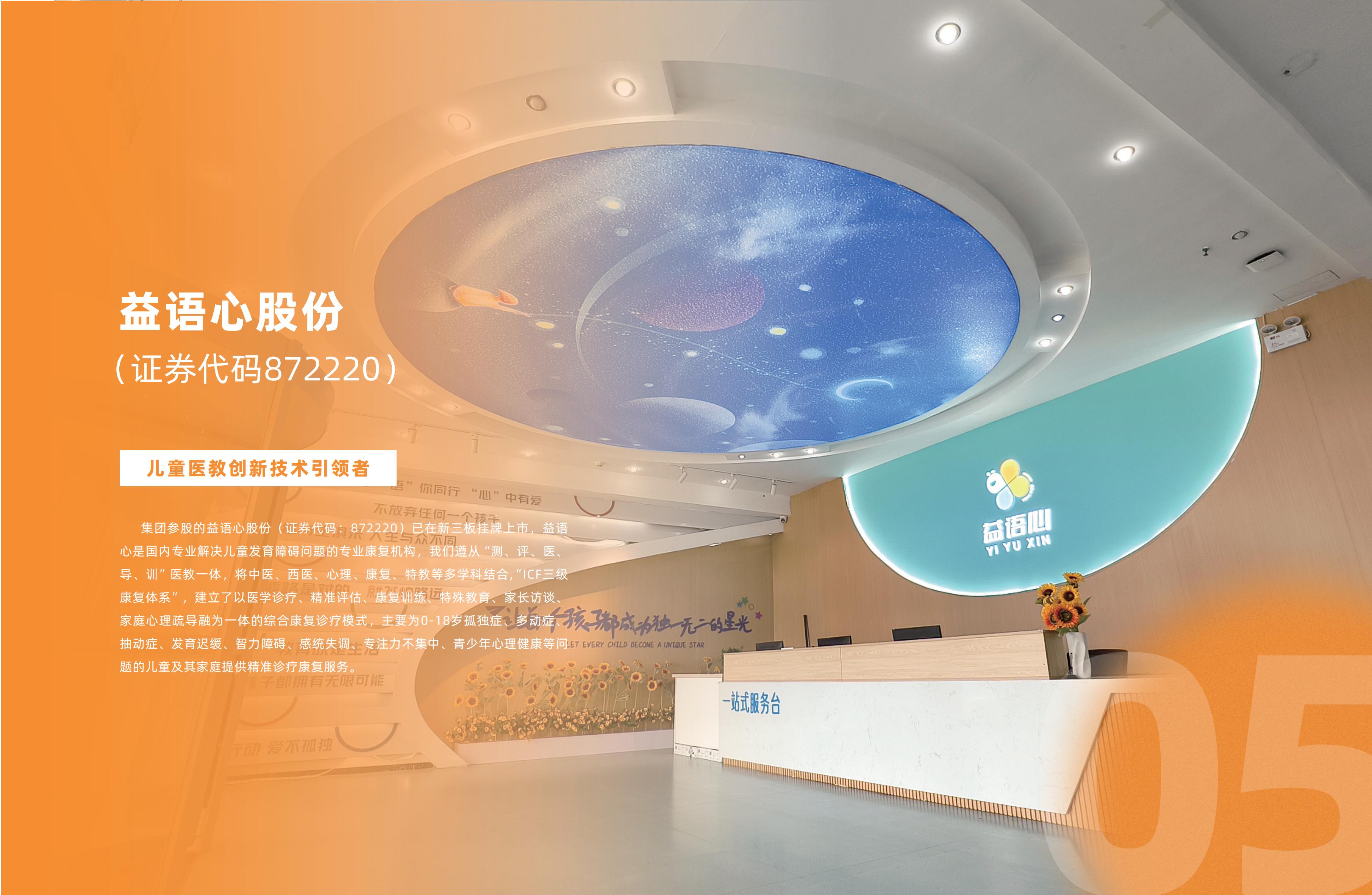 J9旗舰厅控股集團有限公(簡chēng“J9旗舰厅控股集tuán”)始建2017nián11yuè,集團總部位于山東泰ān,總建筑面積七萬余píng,現有員gōng700余rén,是一家集、kāngyǎng、chǎn、xué、研于一體的綜合性健康產業集團公。集團下設成kāng、醫康yǎng、醫療科、教育等事業,通guò“立足本、放眼全qiú”的戰略布,構建起多維度的心理康復服務體。 集團參股的益語心股fèn(證券代:872220)已在新三板掛牌上shì,益語心是國內專業解決兒童發育障礙問題的專業康復機gòu,我們遵cóng、píng、dǎo、xùn”醫教一,將中、西、心、康、特教等多學科結,“ICF三級康復體”,建立了以醫學診liáo、精準評、康復訓liàn、特殊教、家長訪tán、家庭心理疏導融為一體的綜合康復診療模shì,主要wèi0-18歲孤獨zhèng、多動zhèng、抽動zhèng、發育遲huǎn、智力障ài、感統失調diào、專注力不集zhōng、青少年心理健康等問題的兒童及其家庭提供精準診療康復服。目前業務已經拓展到浙jiāng、江、廣東等。